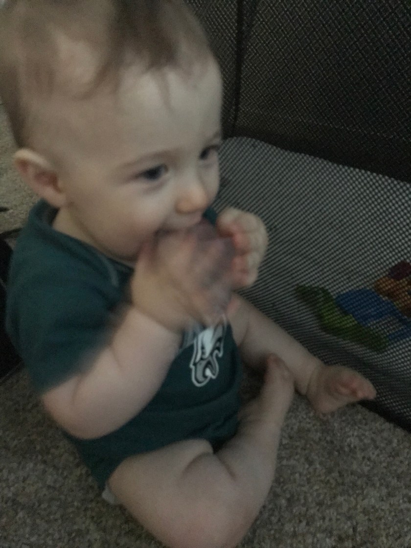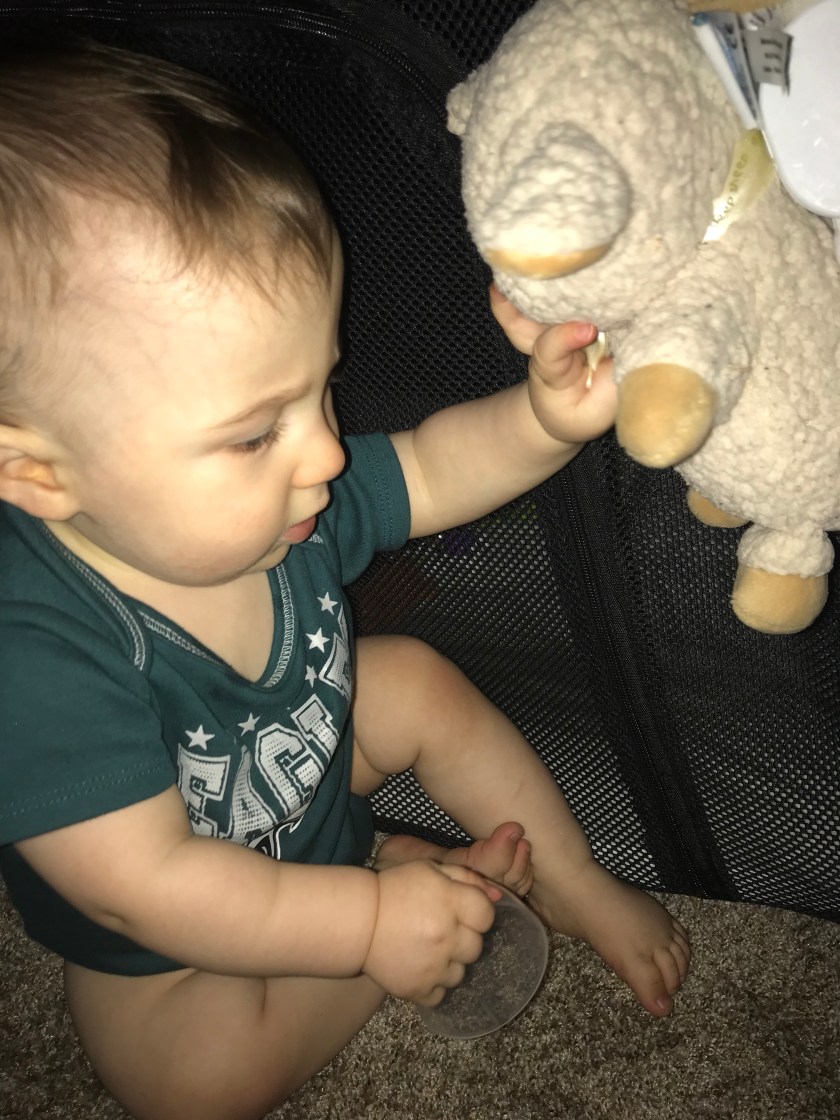Yet, it hasn’t seemed like he’s used either as a word, he’s still babbling and occasionally but accident says it close to a word. He’s added mamamama and gagagga and a kuhkuh sound, so a real word or two should be in range soon.