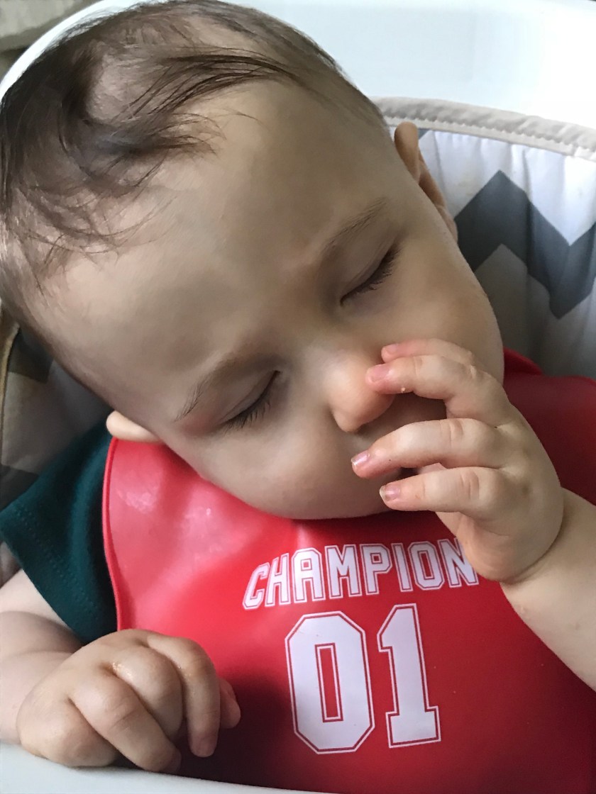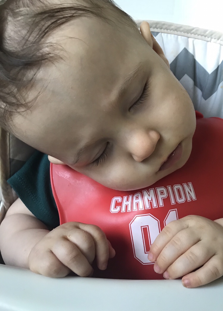 William fights sleep at bedtime for the most part. On this day due to errands he was fed close to his bedtime and promptly fell asleep in his high chair.