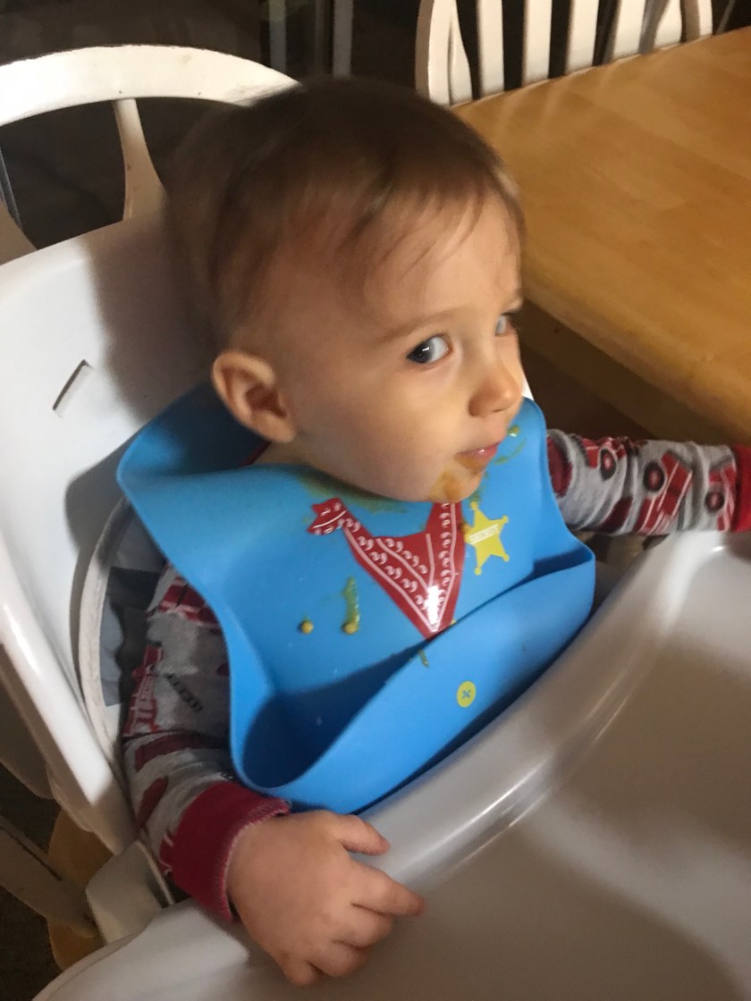 As far as talking, he’s still in streams of close to words, yet we have a lot of time paying attention to what he’s almost saying. Matt likes to see if he can say something similar to “om nom nom” when he eats. He is saying nom a bit in strings.