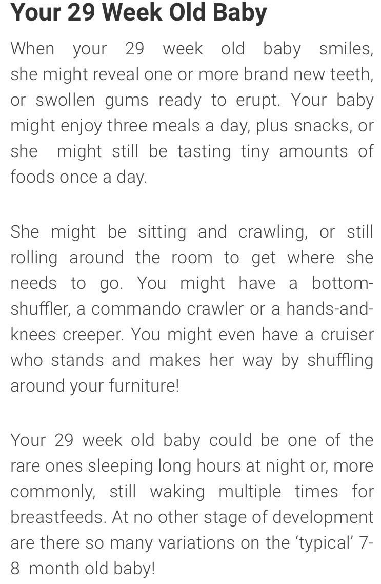 Once again a snippet about baby’s development week is rather significant to William’s development. Right now William is for the most part being given only pureed foods. We did give him small crushed up tiny pieces from our lasagna on Mother’s Day, yet besides that we are not trying food from our plates just yet.