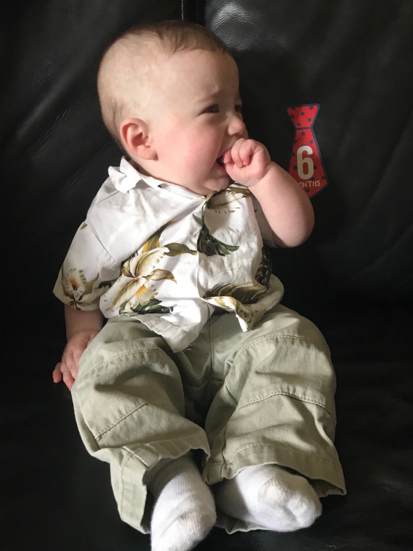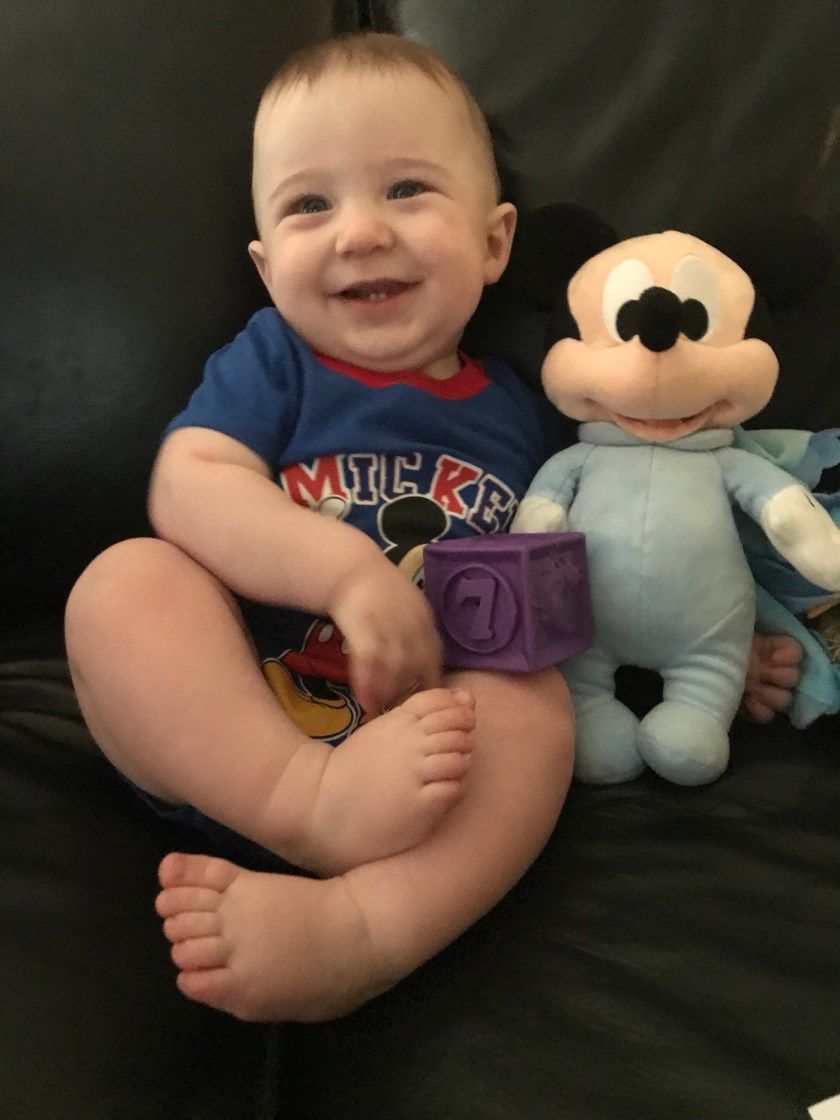 For William’s seven month photo shoot I went with a Mickey theme as he has some adorable Mickey clothes and a stuffed Mickey that is a present from his Godparents. Matt warned me before I started the session that putting him on the couch, the usual spot would not work as he was in an active mood. Even though it was a short time before his bedtime, it turns out Matt was right.