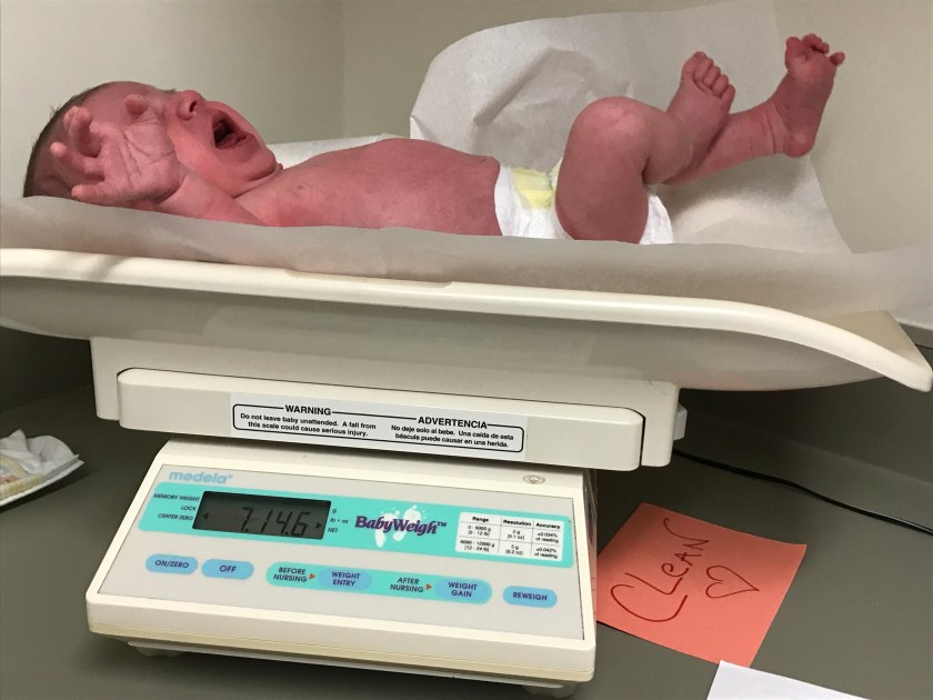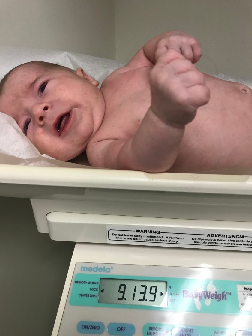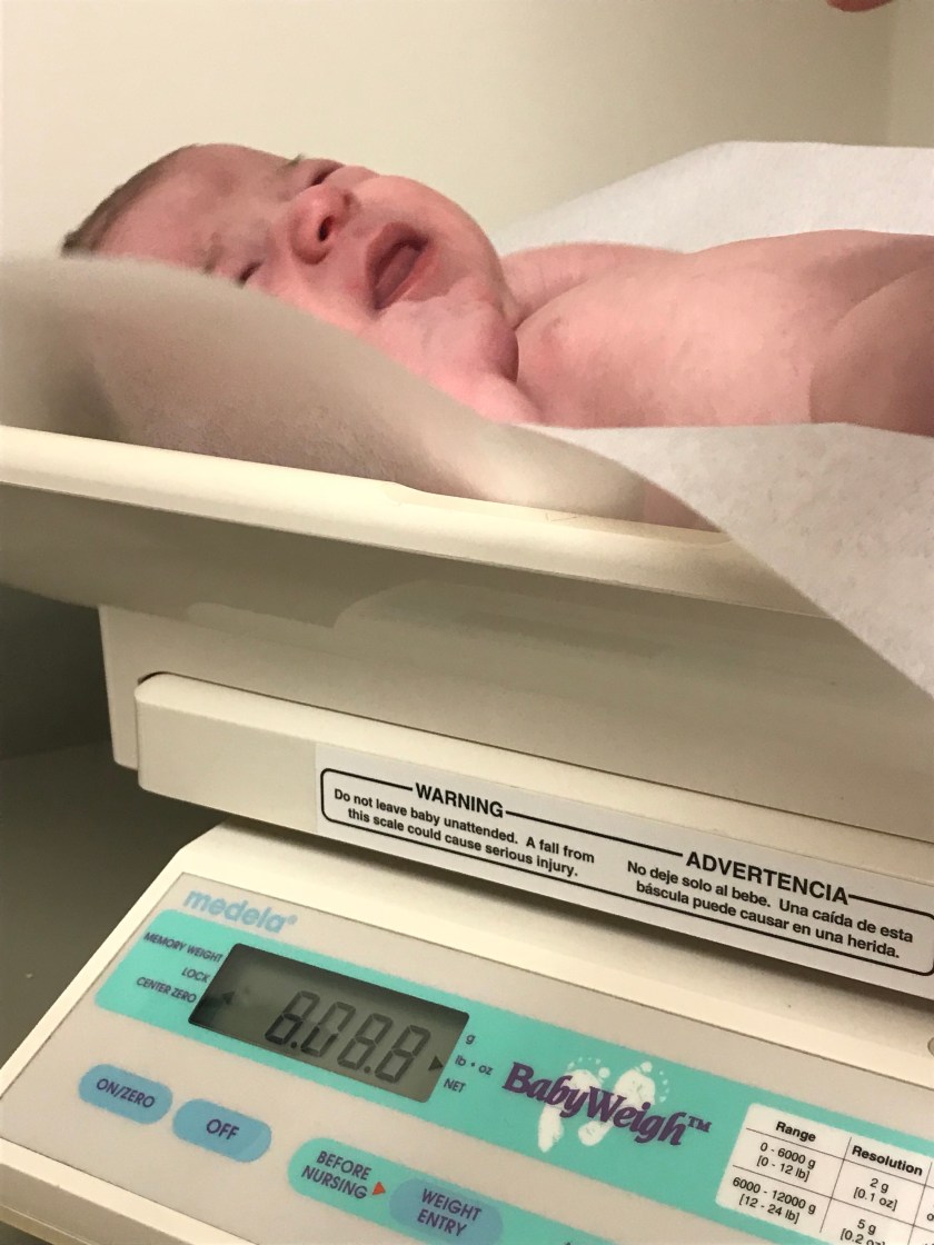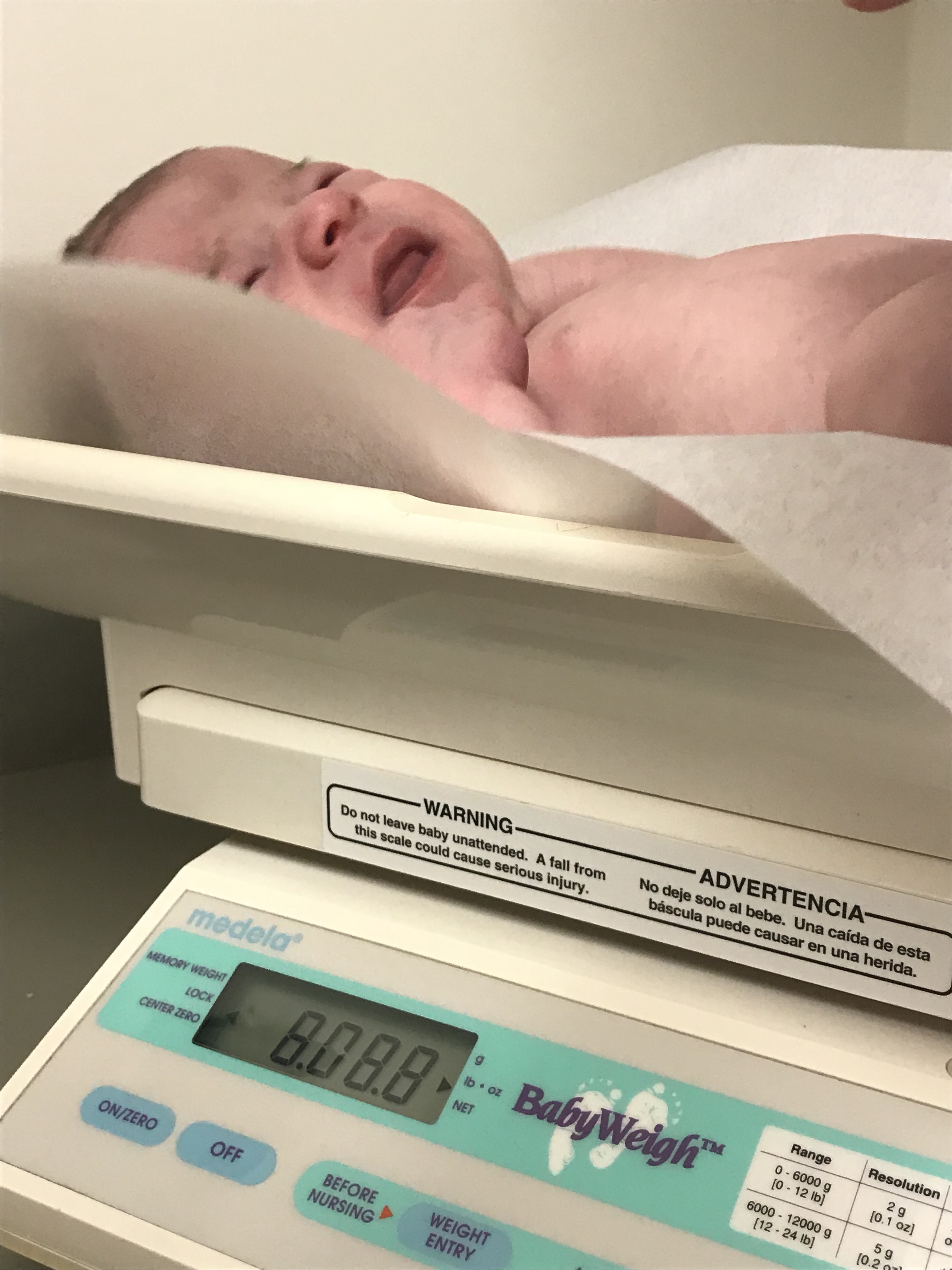 One of the best indicators of how feeding is going for a baby is by weight. As is typical, our Lactation Consultant, Donna weighed William several times throughout his appointment. With just a diaper on (with a negligible weight, yet it also is weighed and subtracted), it is apparent he is gaining weight. Still, as the goal is for him to be weaned off formula and take in only breastmilk as soon as is possible and beneficial for him, we are hoping a lot of that weight gain is not from formula. He is currently getting about eight ounces of formula over two feedings, so most of his feedings, six or so daily, are entirely or in large part made up only of breastmilk.